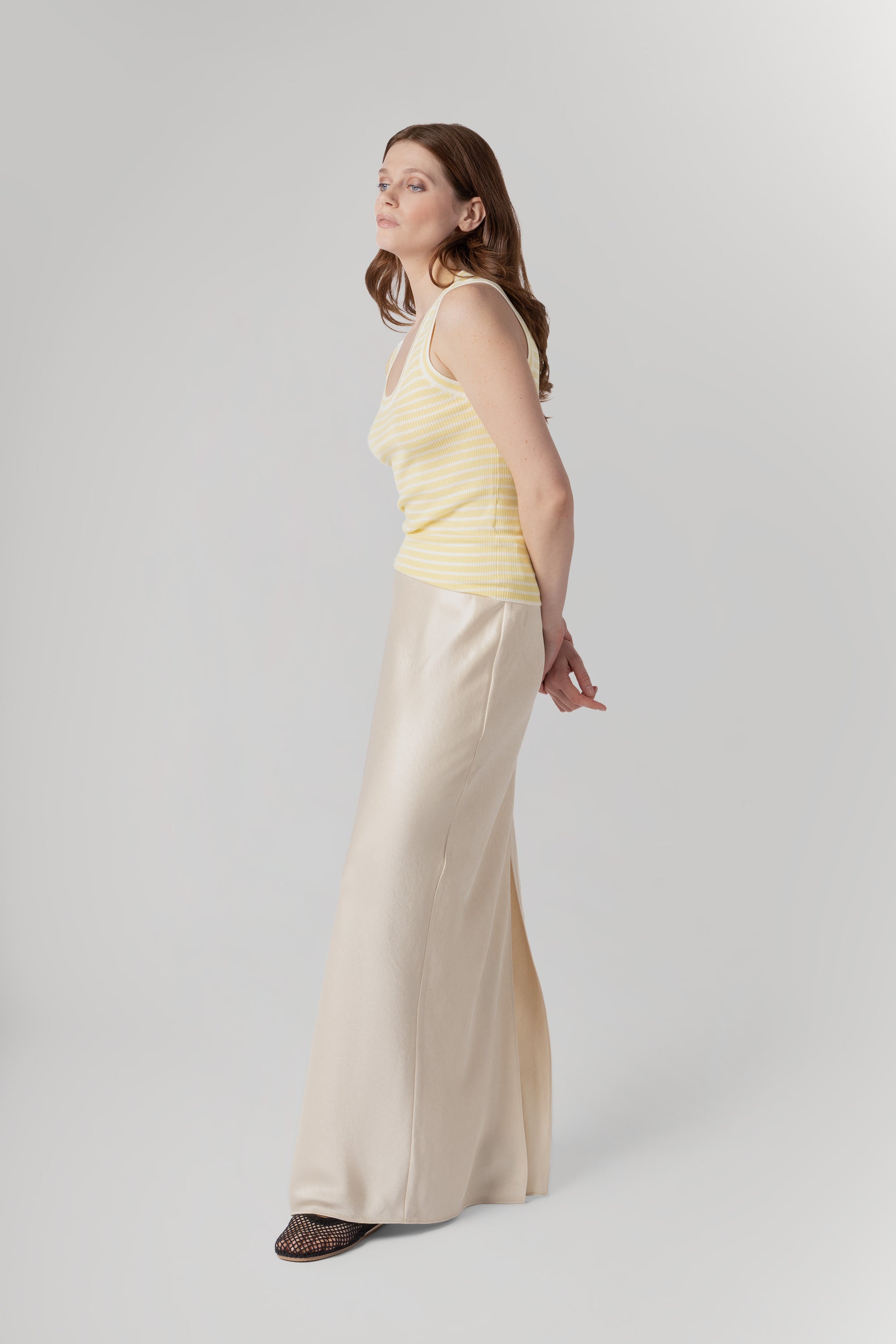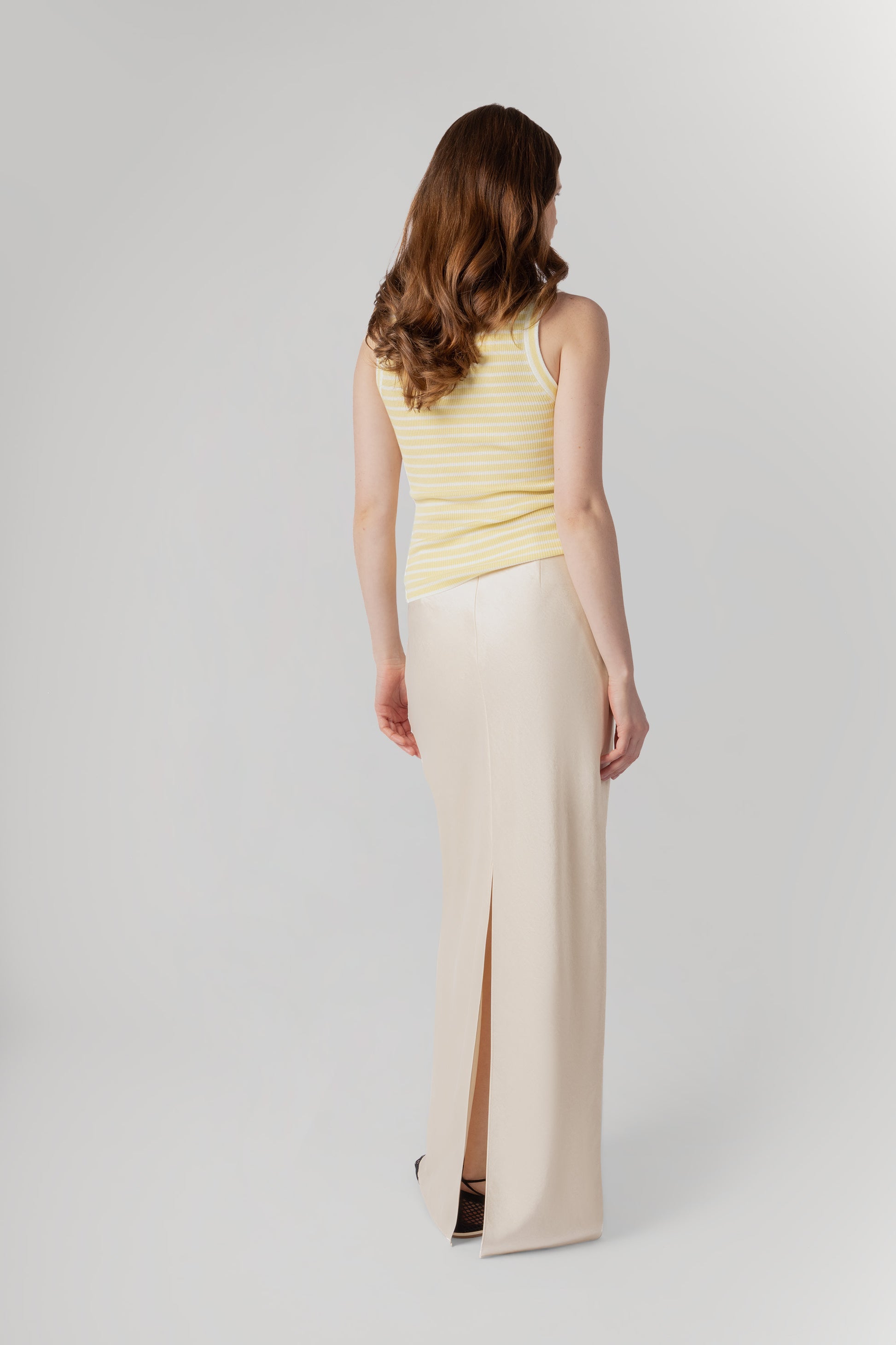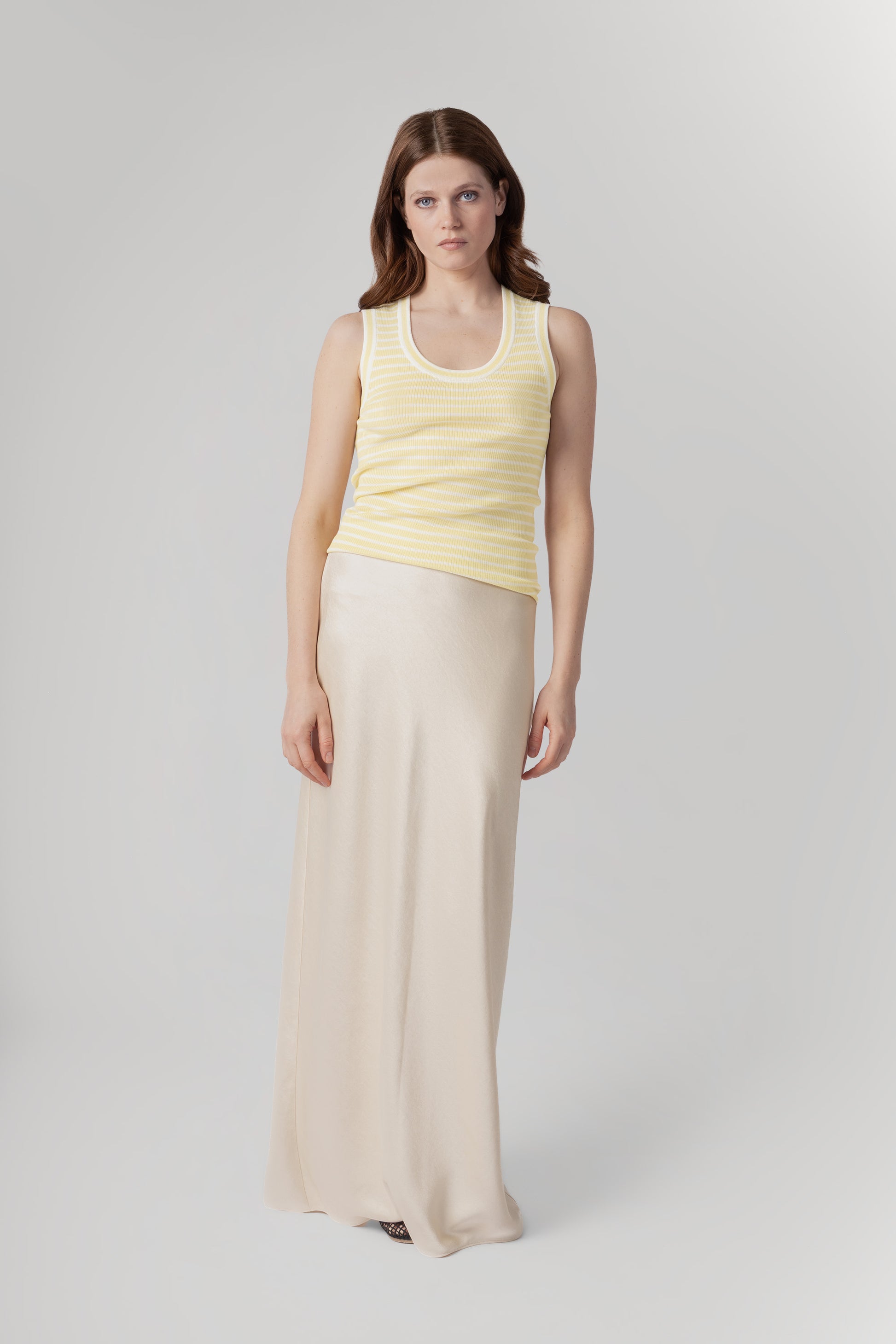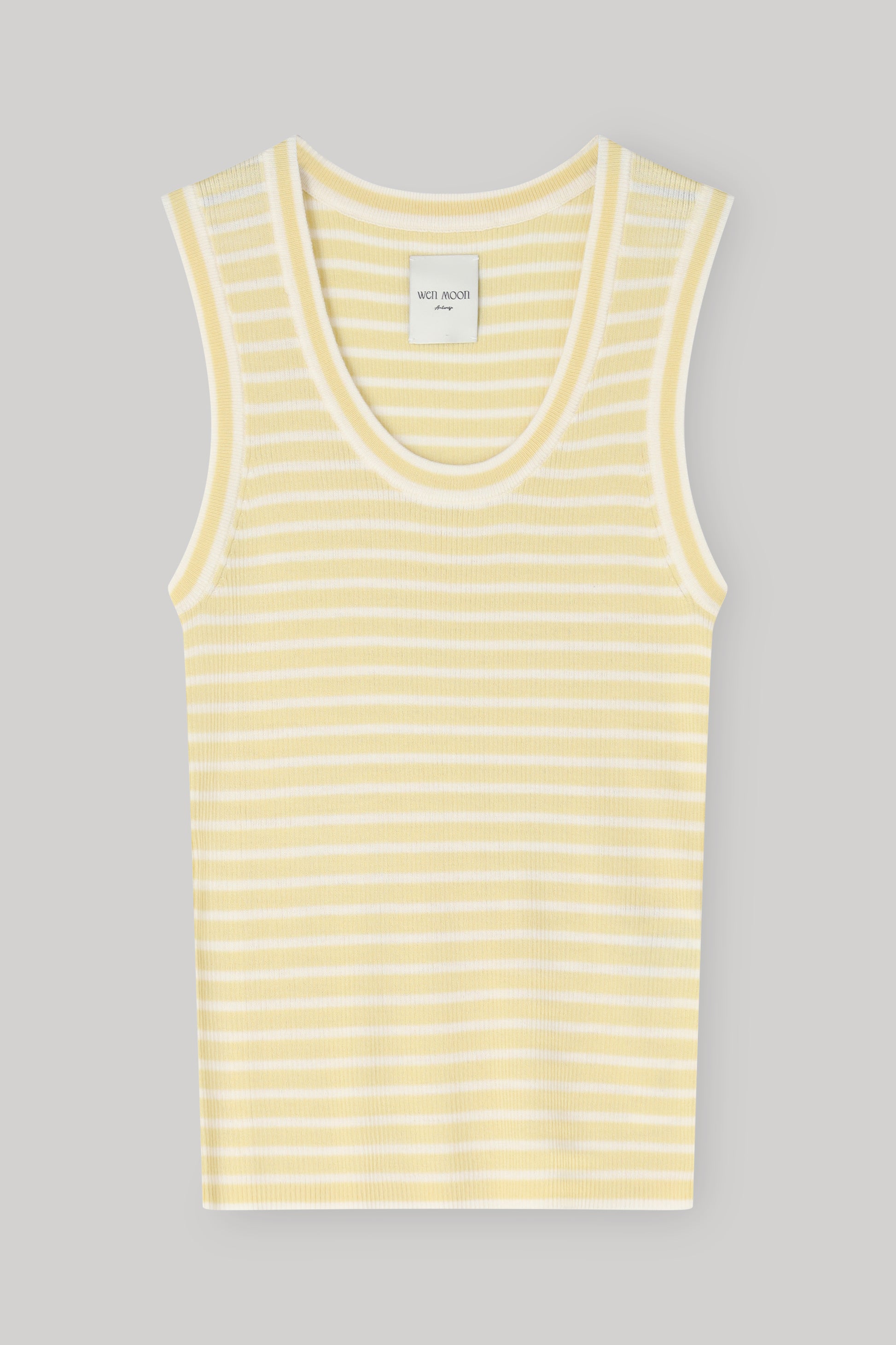 Ming Striped Top - Butter & White The Ming top is a refined layering essential defined by softness, texture, and versatility. Crafted from a luxurious blend of 25% silk and 75% wool, it feels exceptionally smooth against the skin while offering natural warmth and breathability. Designed in a fine ribbed structure, Ming has a gently fitted silhouette that flatters without feeling restrictive. The round neckline is cut slightly deeper, adding a subtle femininity that makes the piece equally elegant worn on its own or layered beneath a blazer, cardigan, or knit. Effortless and adaptable, the Ming top is designed to move seamlessly between seasons — a quiet foundation piece that elevates every layer built around it.
